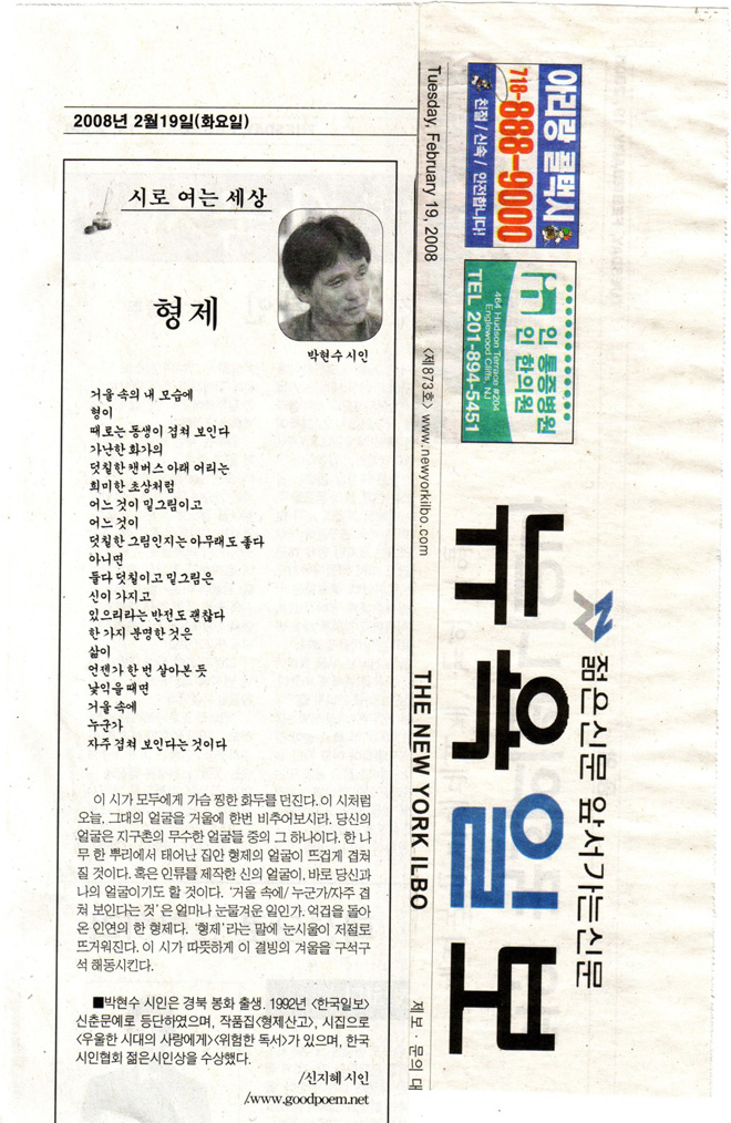 이 시가 모두에게 가슴 찡한 화두를 던진다. 이 시처럼 오늘, 그대의 얼굴을 거울에 한번 비추어보시라. 당신의 얼굴은 지구촌의 무수한 얼굴들 중의 그 하나이다. 한 나무 한 뿌리에서 태어난 집안 형제의 얼굴이 뜨겁게 겹쳐질 것이다. 혹은 인류를 제작한 신의 얼굴이, 바로 당신과 나의 얼굴이기도 할 것이다. '거울 속에/ 누군가/자주 겹쳐 보인다는 것'은 얼마나 눈물겨운 일인가. 억겁을 돌아온 인연의 한 형제다. '형제'라는 말에 눈시울이 저절로 뜨거워진다. 이 시가 따뜻하게 이 결빙의 겨울을 구석구석 해동시킨다. 박현수 시인은 경북 봉화 출생. 1992년 <한국일보> 신춘문예로 등단하였으며, 작품집<형제산고>, 시집으로 <우울한 시대의 사랑에게><위험한 독서>가 있으며, 한국시인협회 젊은시인상을 수상했다. <신지혜 . 시인>